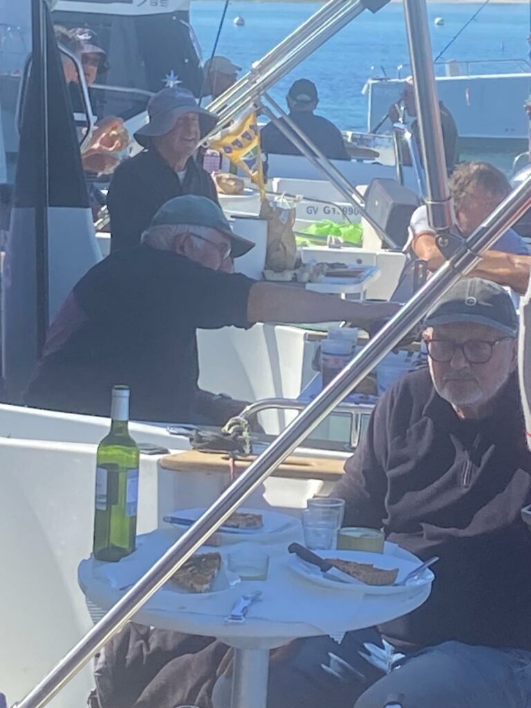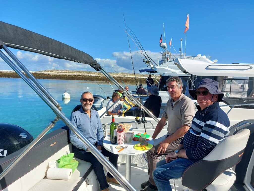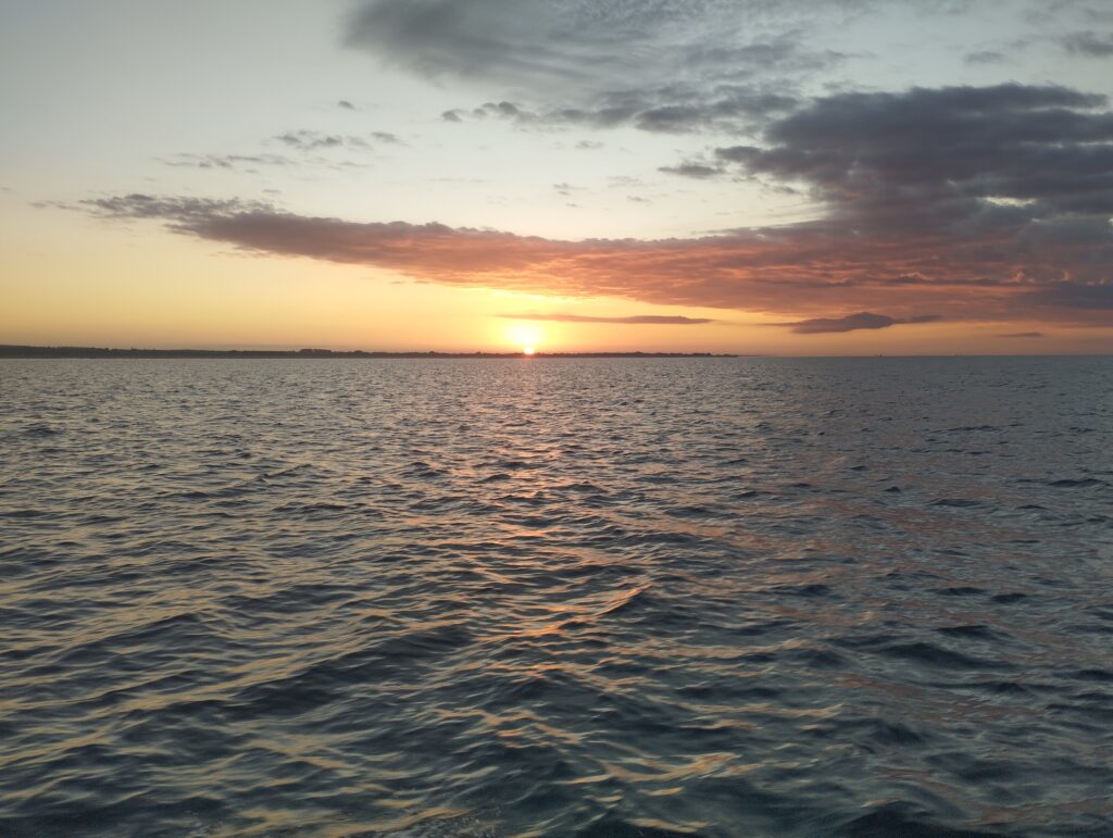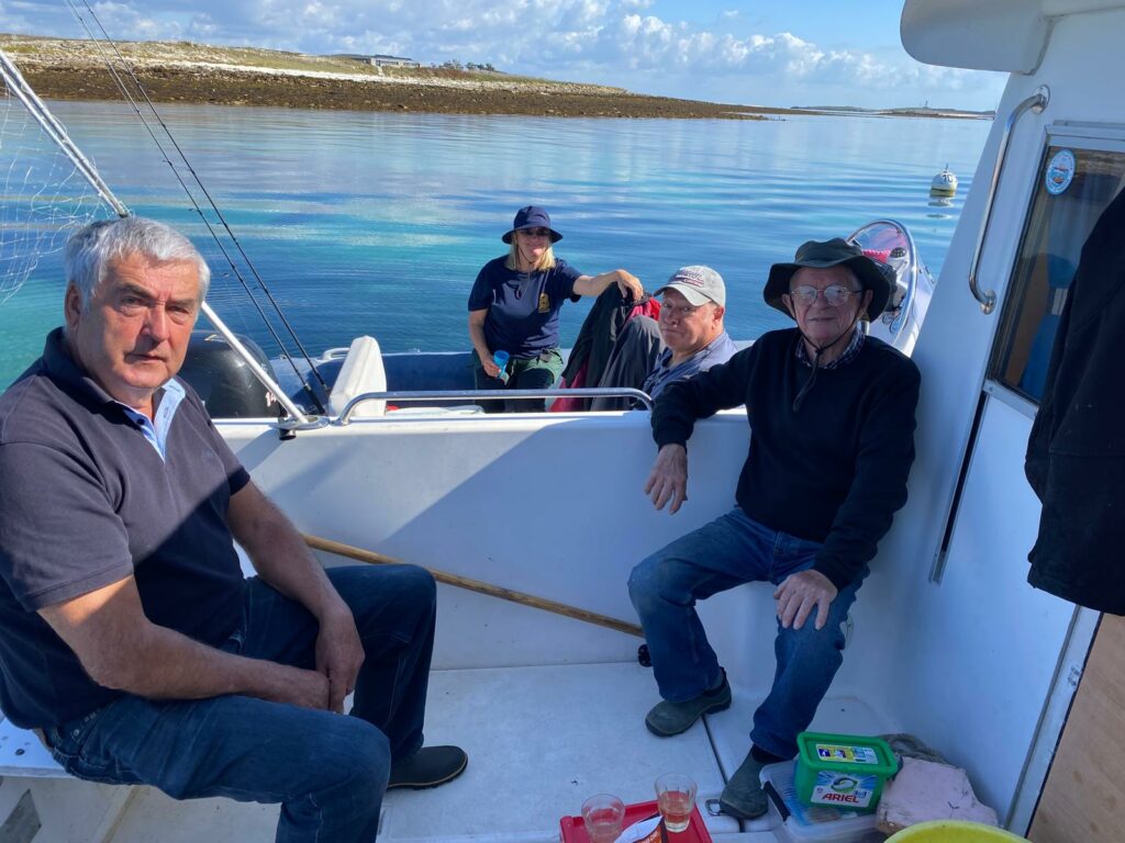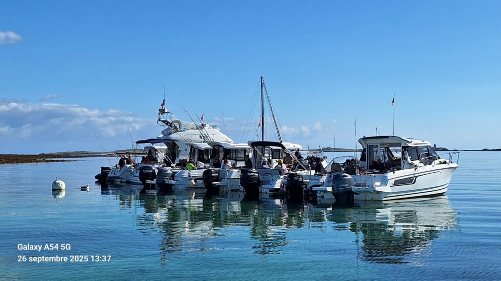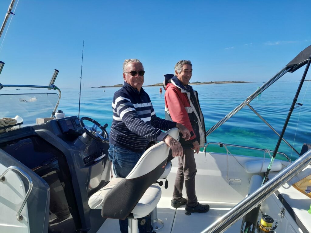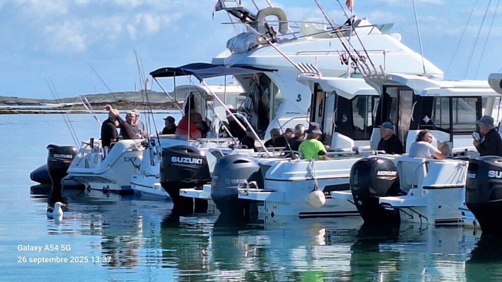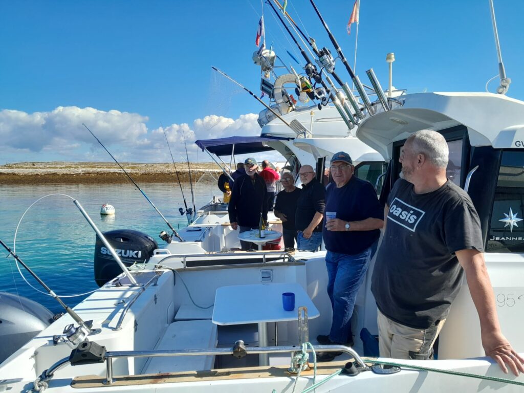 vendredi 26 septembre a eu lieu notre deuxième sortie en eaux profondes. Moins d’une dizaine de bateaux étaient présents. La météo matinale était fraîche et un peu ventée ce qui nous a permis de voir un magnifique lever de soleil. Les bateaux se sont répartis sur plusieurs zones (Jument, Pérennes, Bluiniers) et malgré cette répartition, le bilan de la pêche est plutôt maigre voire nul. Au moins la corvée du remplissage du carnet de pêche (voulu par nos technocrates en délire) aurait été vite accomplie…Un seul lieu de pris ainsi que quelques maquereaux et chinchards. Donc pas de photos de caisses pleines…Fort heureusement il y avait le casse-croûte dans « la Chambre ». Comme on peut le voir sur les photos, la joie de se retrouver était au rendez-vous. Bref, encore une belle journée.